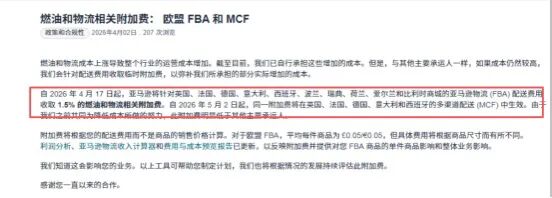 • 2026年4月17日起:FBA配送费临时上调3.5%燃油和物流附加费。