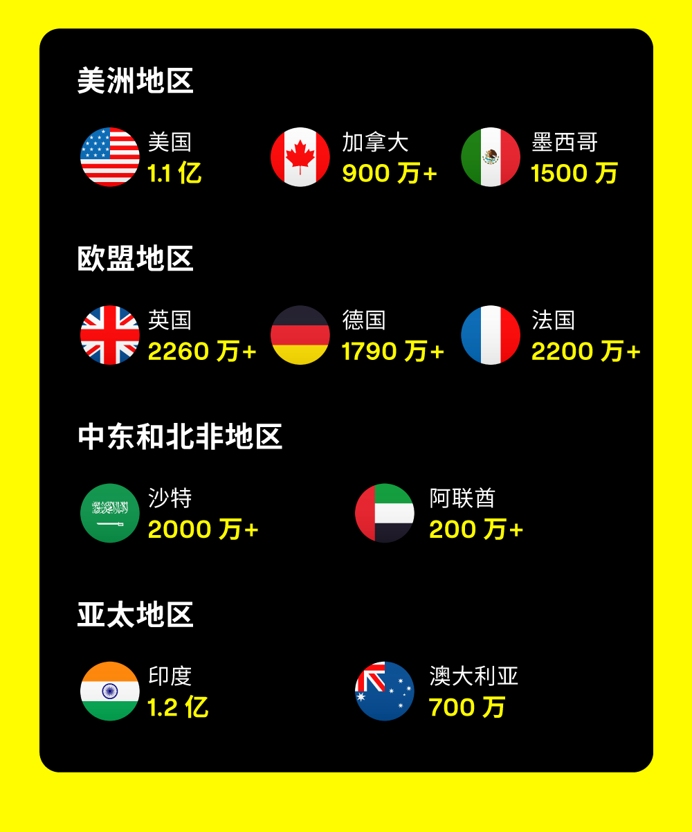 Snapchat 用户遍布全球,覆盖全球核心市场和地区。他们是全新一代的 Snapchatter: