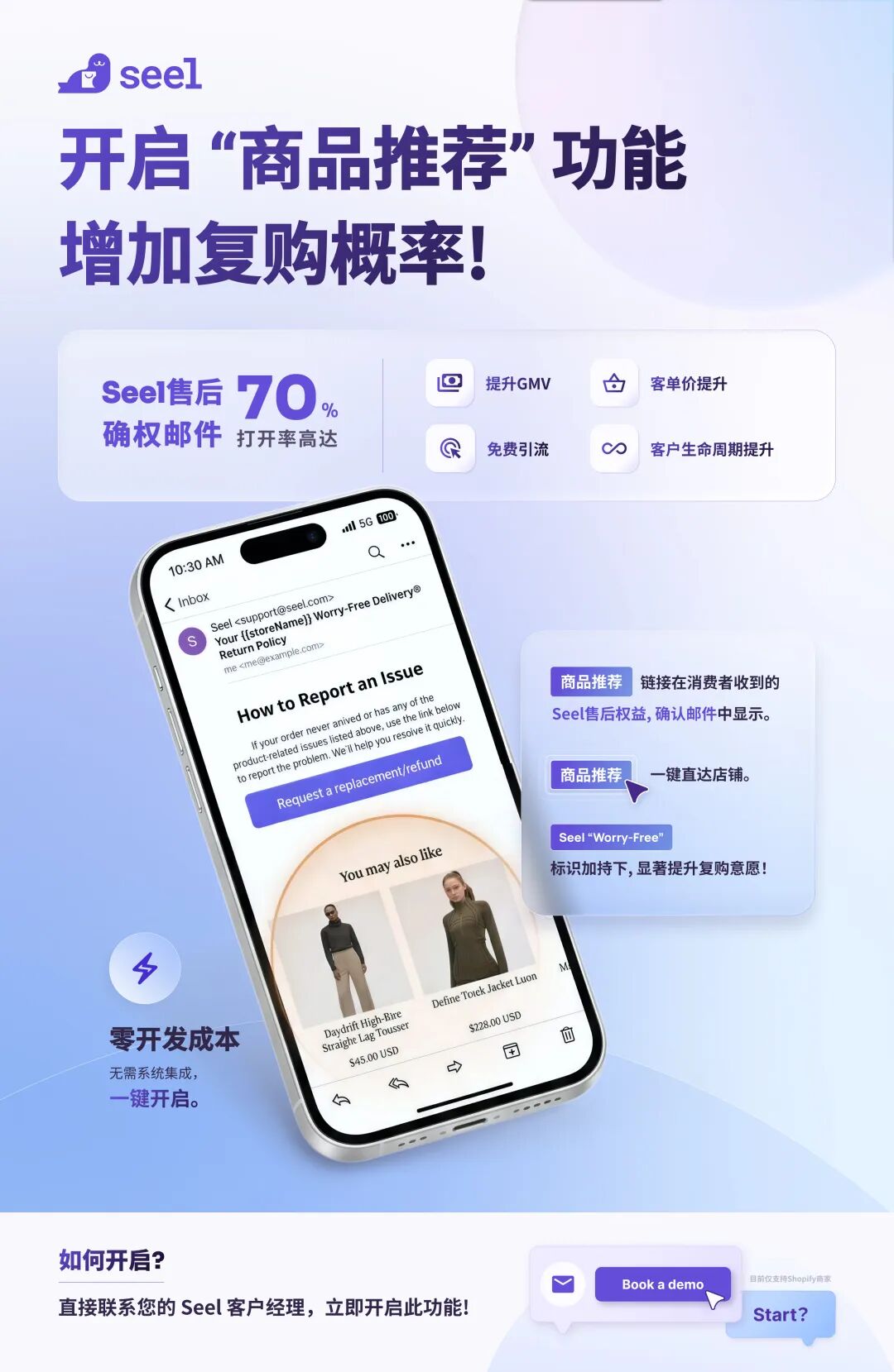 Seel官方数据显示卖家在安装Seel插件后转化率普遍提升5%-8%,而且2026年新增的功能还能在售后邮件底部推荐商品,利用打开率高达70%的邮件把售后确认变成复购入口。